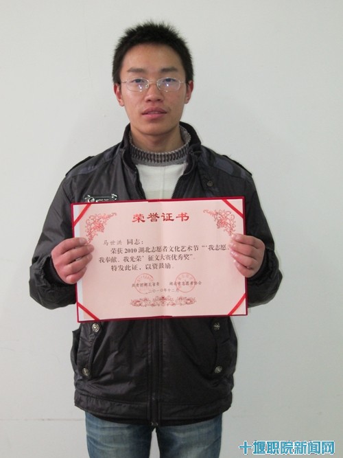 近日,由共青团湖北省委、湖北省志愿者协会主办,中南财经政法大学青年志愿者协会承办的湖北省志愿者文化艺术节之征文比赛获奖结果已揭晓,我院汽车工程系2009级学生马世洪获得2010湖北志愿者文化艺术节“我志愿、我奉献、我光荣”征文大赛优秀奖。