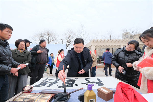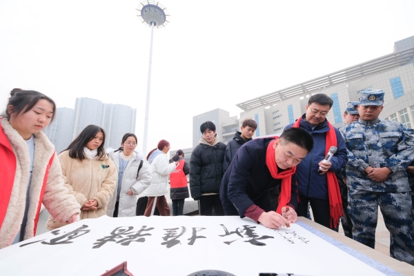新闻网讯(文/图 记者 熊超 曾刚)12月28日下午,beat365中文官方网站邀请十堰市著名书画家操建华、李发山、黄家喜、叶继成、赵虹、姚强、李永涛、刘亚军、杨永志在学校慧智广场现场挥毫泼墨,为师生展示书法、美术创作技法并义务创作,和beat365官网学生书画协会的同学亲切交流研讨,并一同为师生书写春联,送上新春的祝福。校党委副书记、校长边疆,校党委委员、副校长、党委宣传部长胡昌龙参加活动。